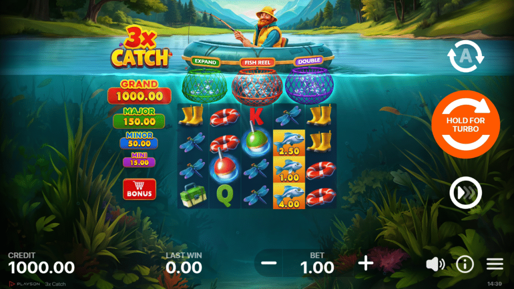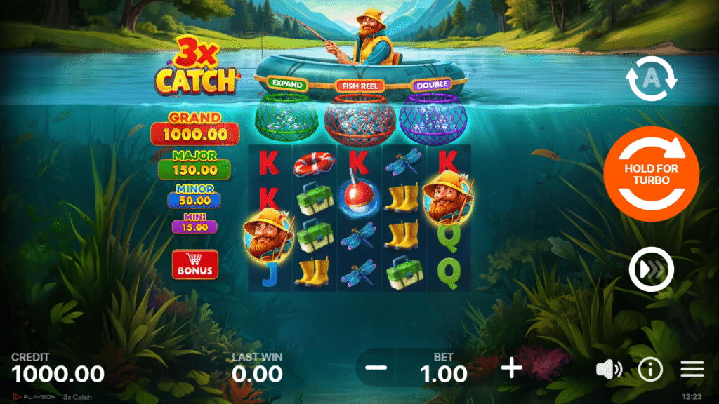 3x Catch offers a classic fishing-themed visual direction executed with clarity and charm. The underwater backdrop, layered with soft gradients, light rays, and aquatic elements, creates a relaxed and inviting atmosphere. The art style leans towards playful realism rather than heavy stylization, making it broadly appealing and easy to engage with over extended sessions.