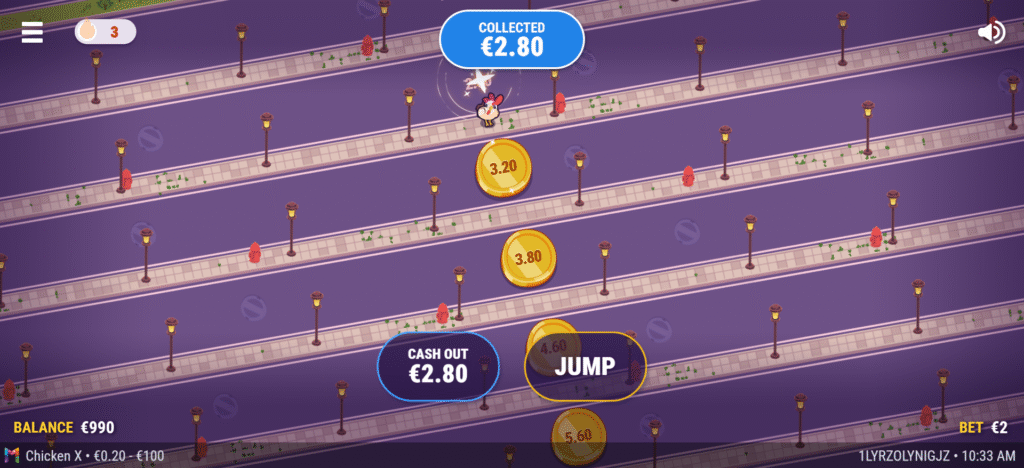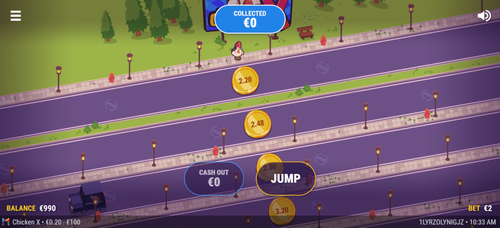 Centred around the universally recognizable image of a chicken crossing a busy highway, Chicken X adopts a minimalist, arcade-inspired visual identity. The design departs from traditional slot machine narratives, focusing instead on a clean, structured environment defined by road lanes, moving vehicles, and the protagonist. This approach creates an immediate and intuitive visual language in which danger and progress are clearly communicated.