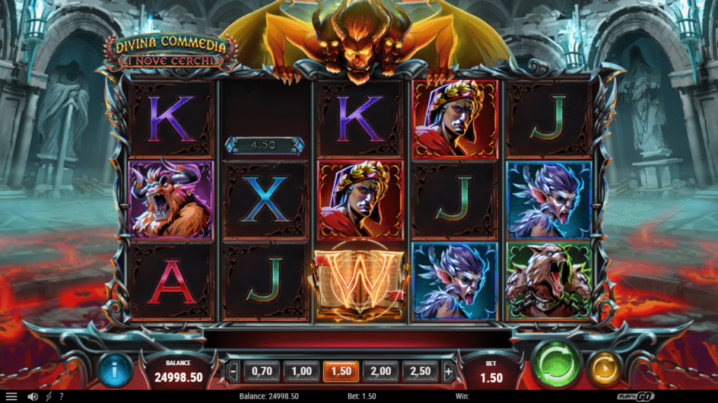 The animations in Divina Commedia I Nove Cerchi are well-tied to the mechanics each movement reinforces the game’s state changes and feature logic, making it easy for players to follow along while maintaining thematic momentum.