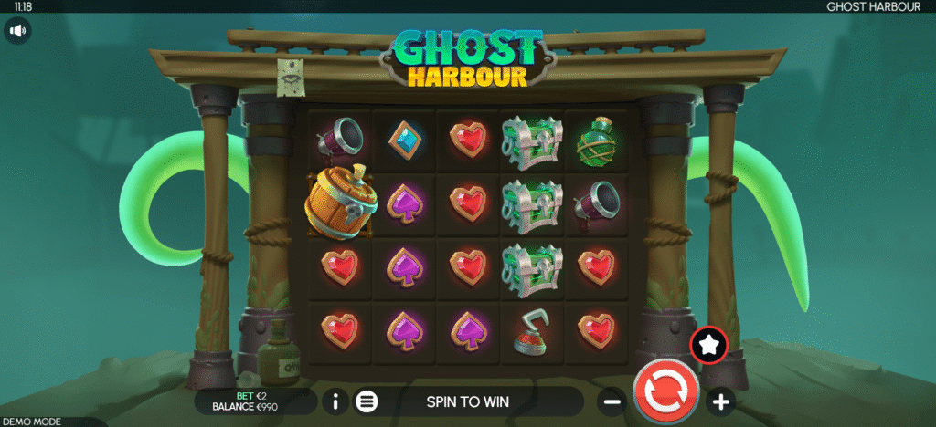 The game features a 5×4 reel layout designed with environmental art that supports a ghost-pirate narrative. The symbol design generally reflects elements of maritime adventure, such as treasure, pirate artifacts, and spectral characters, anchored by the prominent figure of a Ghost Captain, who embodies the supernatural power of the harbour. A dark colour palette, rich in misty blues and spectral highlights, reinforces the haunted setting while ensuring visual clarity for the gameplay symbols. This balance between environmental storytelling and symbol readability ensures that the theme remains visually immersive without compromising gameplay clarity.