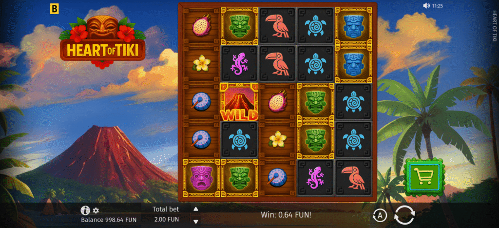 The animation in Heart of Tiki emphasizes fluid movement that complements the island’s natural atmosphere. Moving clouds drift across the sky, while micro-environmental effects enhance the volcanic landscape behind the reels. The game’s expanding Volcano Wild symbol introduces dynamic visual motion, growing in varying sizes across the grid, bringing kinetic energy to the spin cycle.