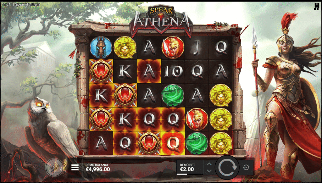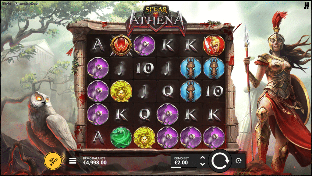 Upon entering Athenaโs Spear, one is immediately drawn into a world steeped in classical mythology and post-war atmosphere. Marble ruins, embers and torchlight, cracked pillars against an old sky, these details reflect the war-torn glory of antiquity. The presence of Athena and her symbolic owl adds gravity, suggesting wisdom, protection and a strong will rather than frivolity. This is not a light fantasy slot; this is a serious mythological tableau.
